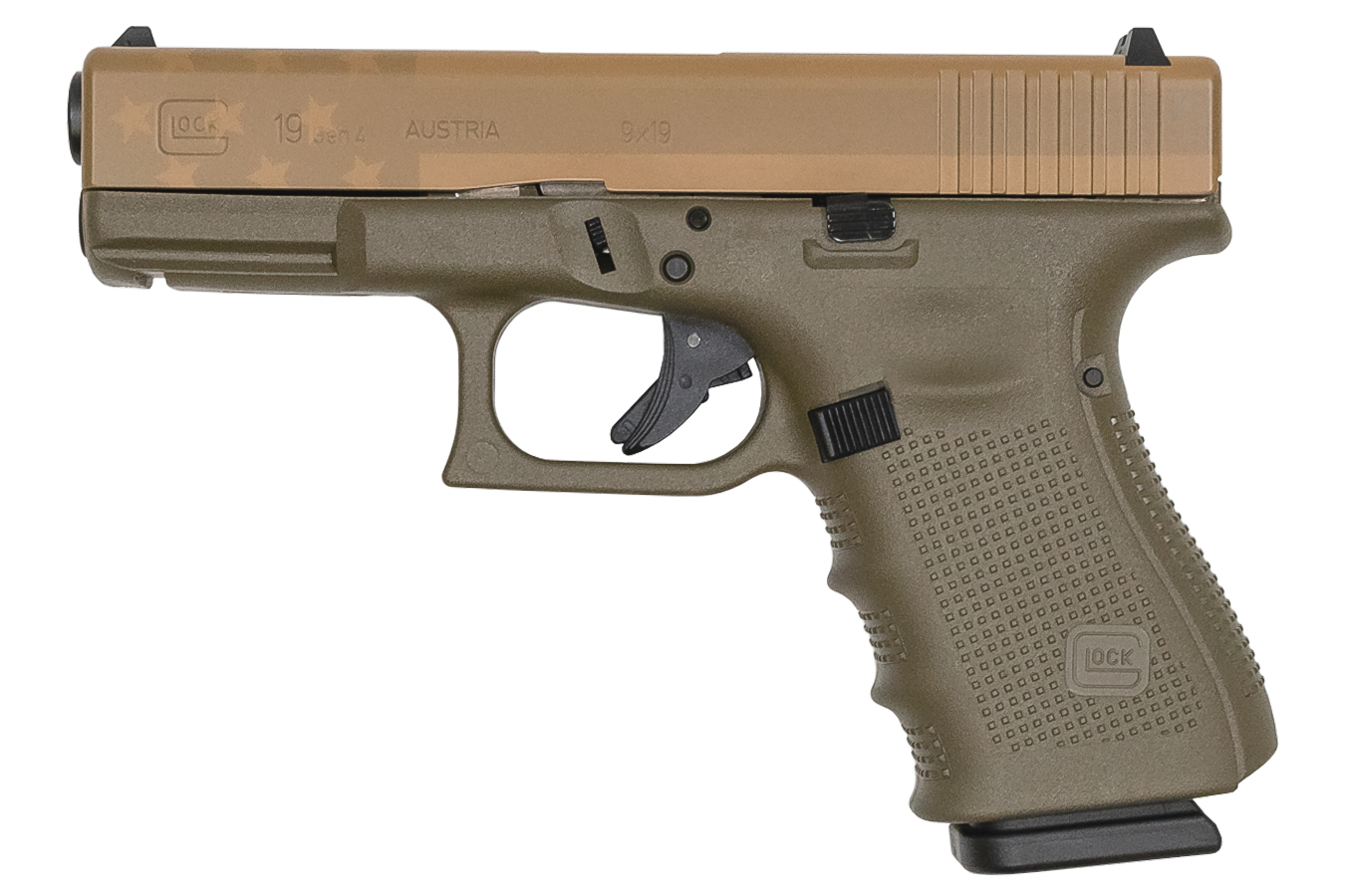 Glock 19 (Gen4) OD Green Pistol American Flag Tan Slide