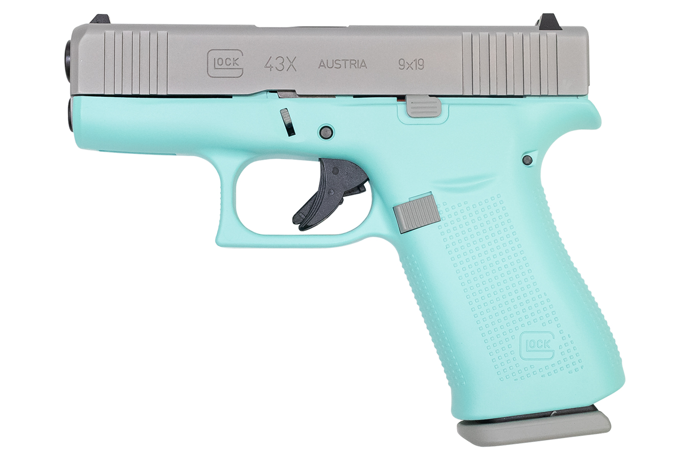 Glock 43x 9mm Pistol with Robin Egg Blue Frame and Silver PVD Slide