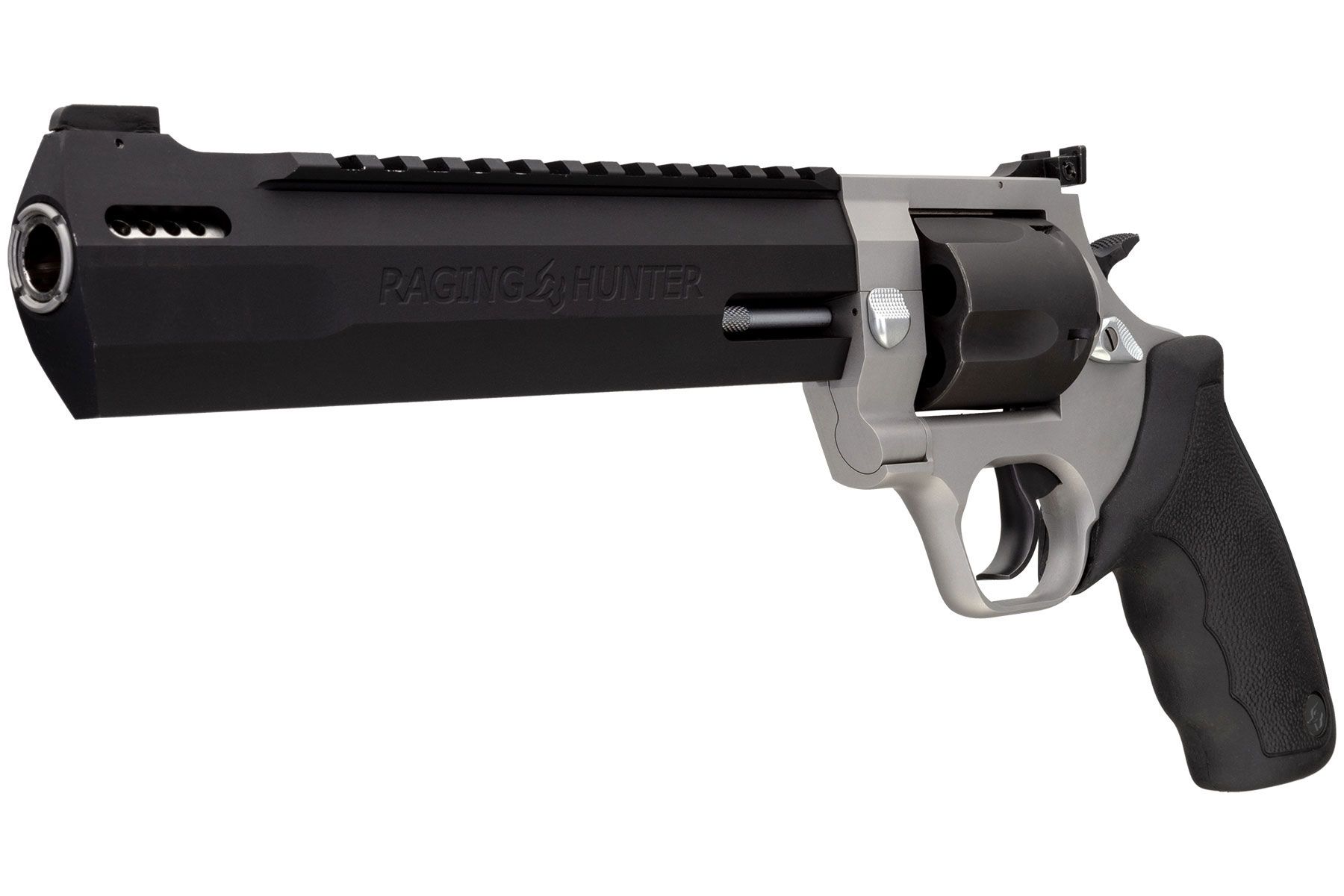 Winner of the 2019 American Hunter Handgun of the Year Golden Bullseye Award, the Taurus Raging Hunter is a next-generation, big-bore revolver that’s first in innovation-and built to last. A fun and effective alternative for short- to medium-range hunting scenarios, this five-shot revolver is chambered in 454 Casull and is available in Matte Black or Two Tone finish. Its revolutionary angular barrel design cuts down on overall weight, while its factory tuned porting and gas expansion chamber reduces muzzle lift for quicker target acquisition. Cushioned insert grips ensure a comfortable, controllable shooting experience.