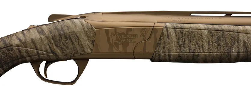 The low-profile Cynergy is an experience in over and under shotguns with performance, recoil control, speed and reliability that you must shoot to fully appreciate. It features the innovative Reverse Striker ignition system; a striker-based, mechanical trigger that offers the benefits of a crisp feel, reduced locktime and less overtravel than other over and under shotguns. The strong MonoLock Hinge design is the integration of the monobloc and the hinge, and has up to 300% more surface area to pivot on than traditional trunnion-style hinges. Rectangular locking pins provide extra strength and feature a “Wear-In Relief” that keeps the action tight. Impact Ejectors are aided by the punch of a secondary striker spring for more positive, reliable ejection of fired hulls from the chambers. This Wicked Wing model features a Mossy Oak Bottomland stock and forend, cerakote burnt bronze receiver, and Invector-Plus extended chokes.
