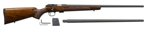 The classic American-style rimfire rifle, this gorgeous 457 has a 24.8” barrel with no sights and is meant to be topped with a scope. Its Turkish walnut stock has a high, flat comb and a classic checkering pattern. Like all of CZ’s 457s, it has an 11mm dovetail milled into the top of its receiver for attaching scope ringmounts. The American Combo ships with both 22 LR and 17 HMR barrel sets and like all 457s it can be easily swapped between those in minutes.