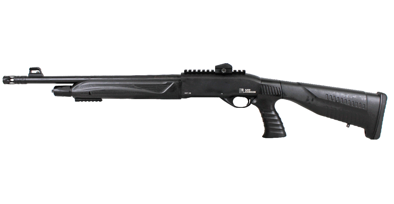 The Iver Johnson HP18-12 is a 12 Gauge Semi-Automatic shotgun with an 18.5″ smooth bore barrel. This shotgun accepts 2-3/4″ & 3″ shells. The stock is two-piece detachable; meaning it comes with a full stock pistol grip, but with the push of a button, the stock detaches and leaves the pistol grip on the shotgun, giving you two types of stock in one. Features an externally threaded muzzle brake to help reduce felt recoil.Brand: Iver Johnson