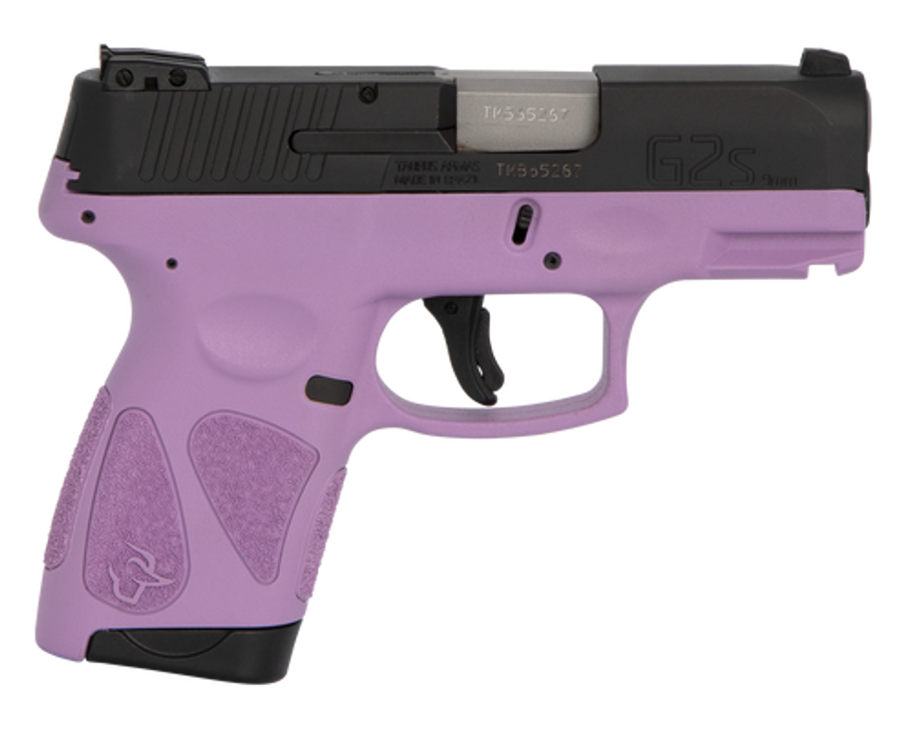 This G2S model has a light purple frame with a matte black carbon steel slide. It includes two 7-round magazines.