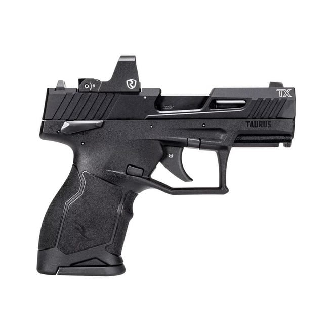 This TX 22 Compact model includes fixed front sight with a white dot and a drift-adjustable, serrated rear sight for accurate aiming. The frame is made of durable polymer with a black finish, and the slide is constructed from aluminum with a hard-anodized black finish.
