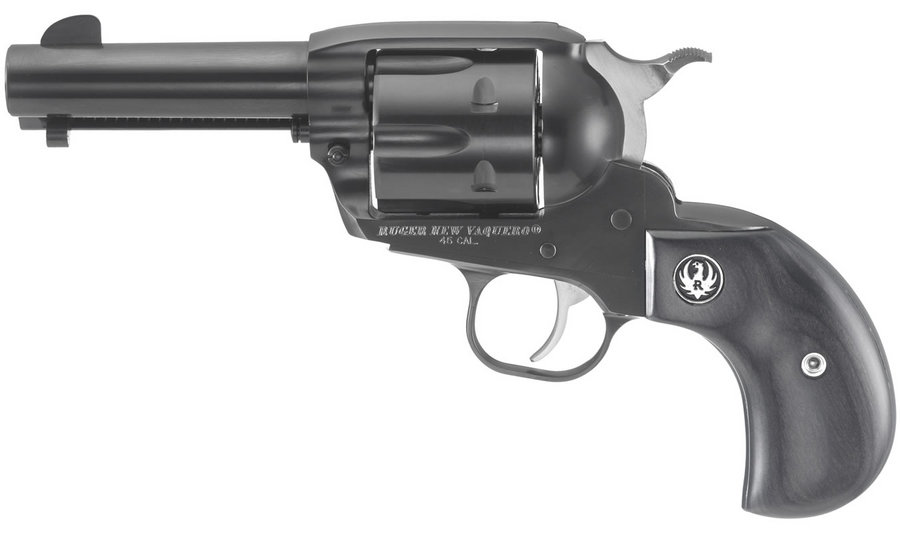 The Ruger Vaquero Birds Head Exclusive Revolver features a steel frame, blue finish, and Black Laminate Gun Fighter Grips.