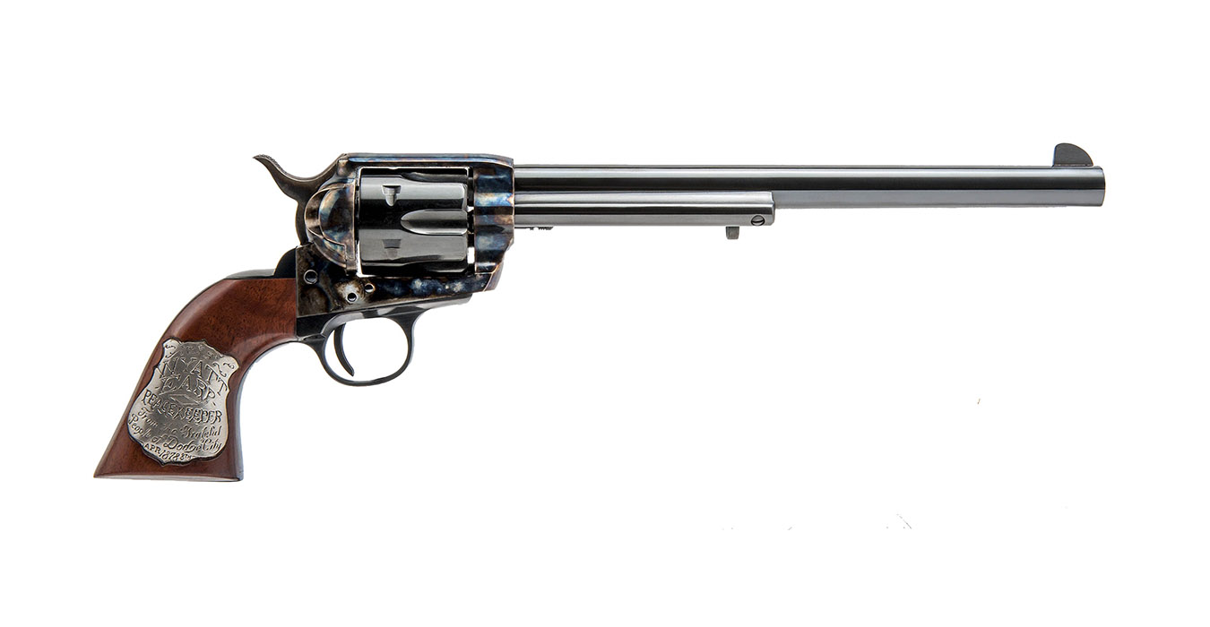 Manufacturer: Cimarron F.A.C. Model: Wyatt Earp Buntline Caliber: 45 Colt Barrel Length: 10″ Finish: Blued Cold Case Grips: Walnut with Sterling Silver Plaque Capacity: 6